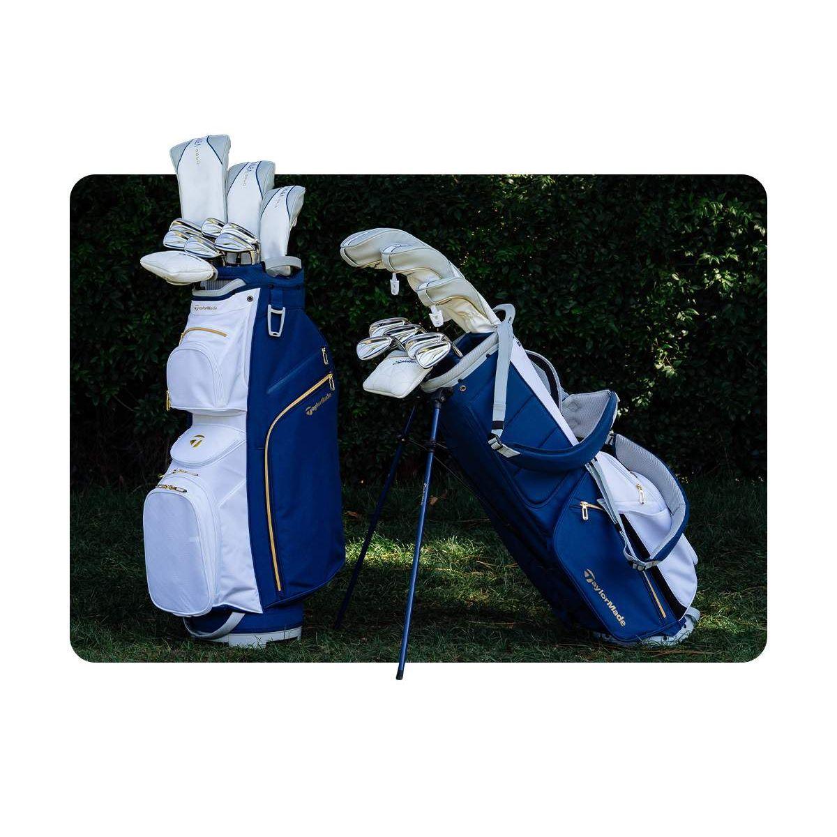 Color choices include blue and white, and grey and white in the cart bag. The stand bag is available in blue and white.