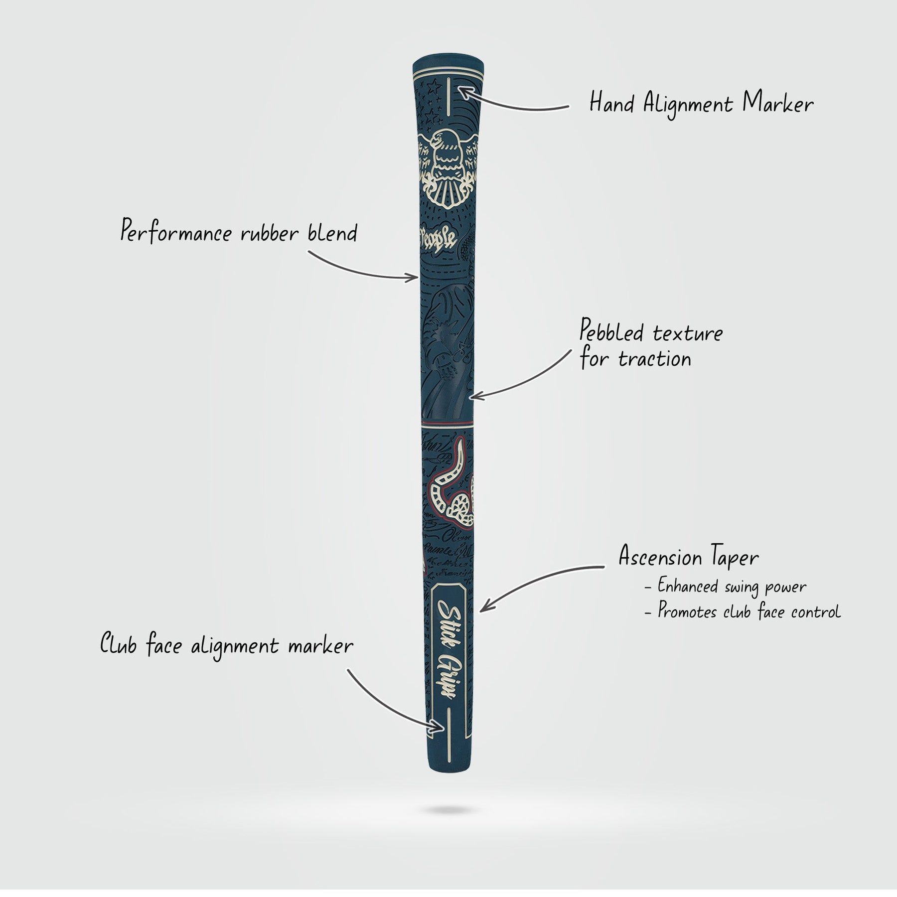 We promise quality, comfort, fit and style and we put that in our Patriot golf grips. The grooved texture through out the grip combined with our performance rubber blend offers a premium grip in all conditions. The thicker lower handle not only provides a premier level of comfort, but enhances your game. Enough about performance..You will look real good too.