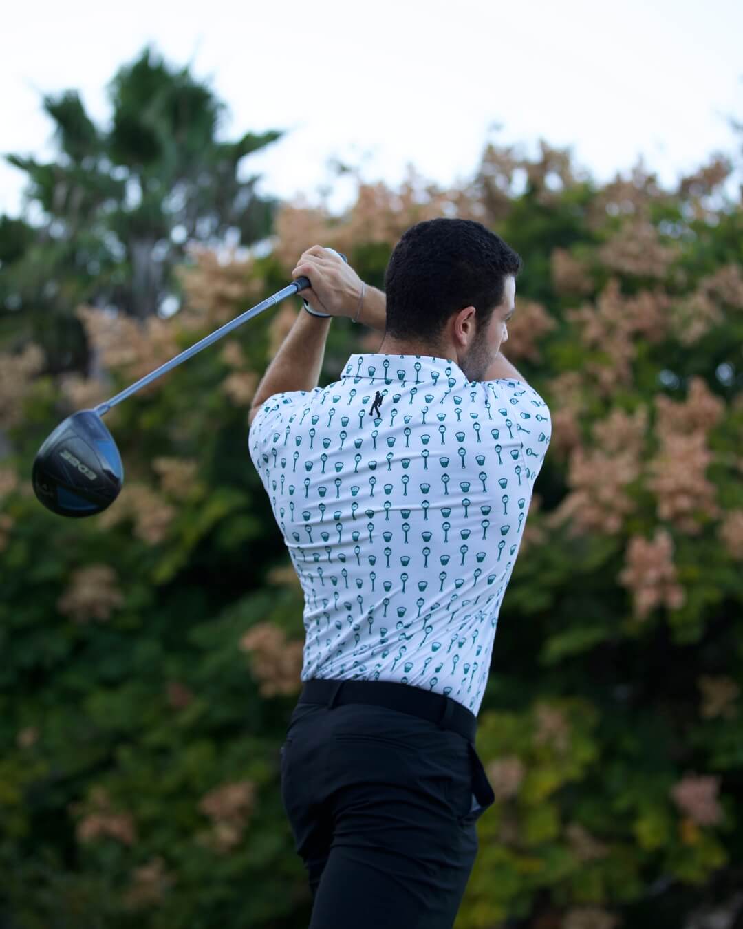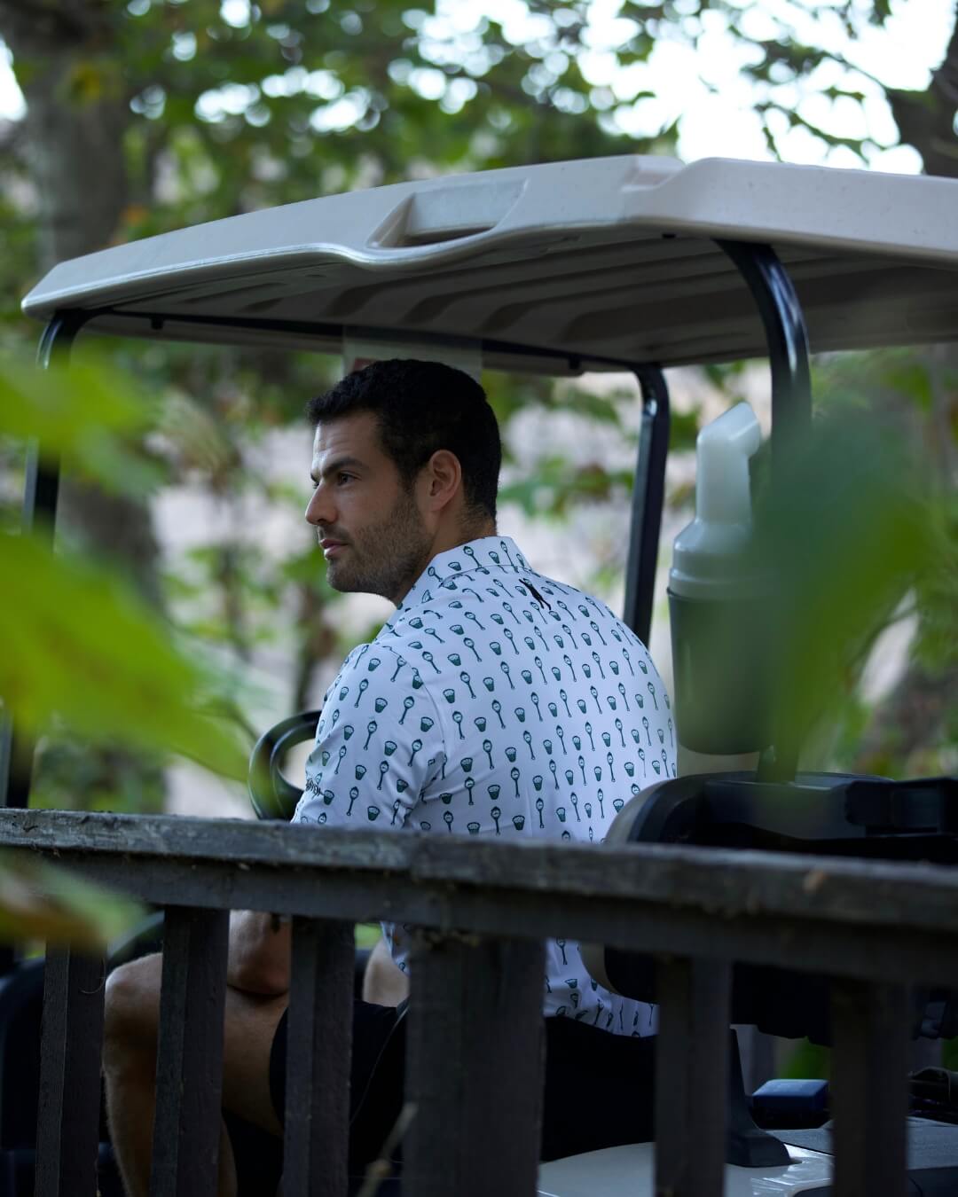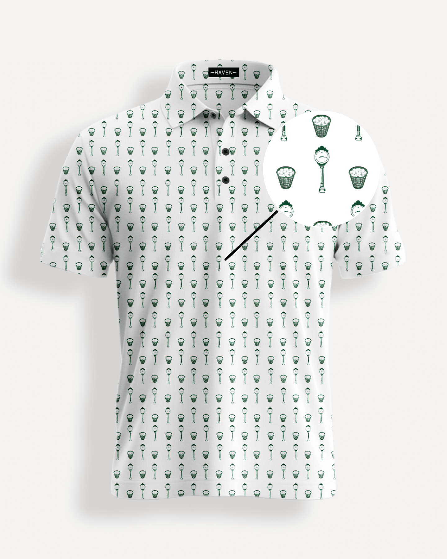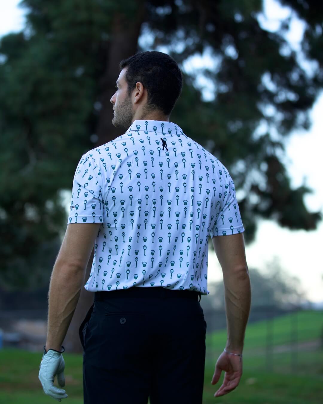 • White polo with country club themed print.